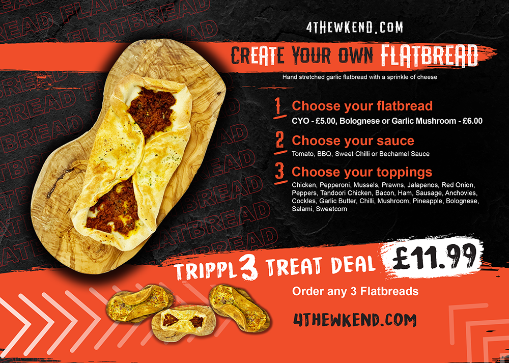 Triple the Deliciousness with Our Triple Treat Flatbread Deal! Indulge in three delectable flatbreads, each a canvas of perfection. Customize your flatbreads with a variety of mouthwatering toppings to create the ultimate trio of culinary delights. It's a flatbread feast that offers something for everyone!